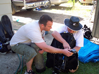 It took only a few minutes to settle in and pick out our bunk beds before we were hauling dive gear out of the ute and setting it all up. Since I haven't been diving more than a few times and Sarge is an instructor he talked me through it while I yelled at him for babying me. Of course, after he obliged by walking off I had to call him back to help. It's just as well my pride is marginal at best ;-)